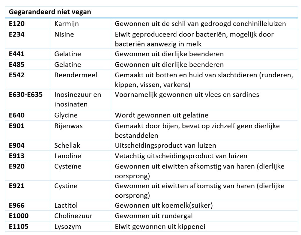 Maar wat nu als je veganistisch wil eten.. Welke E-nummers zijn NIET veganistisch? Een klein overzicht van de E-nummers waarvan met zekerheid gezegd kan worden dat ze van dierlijke oorsprong zijn: